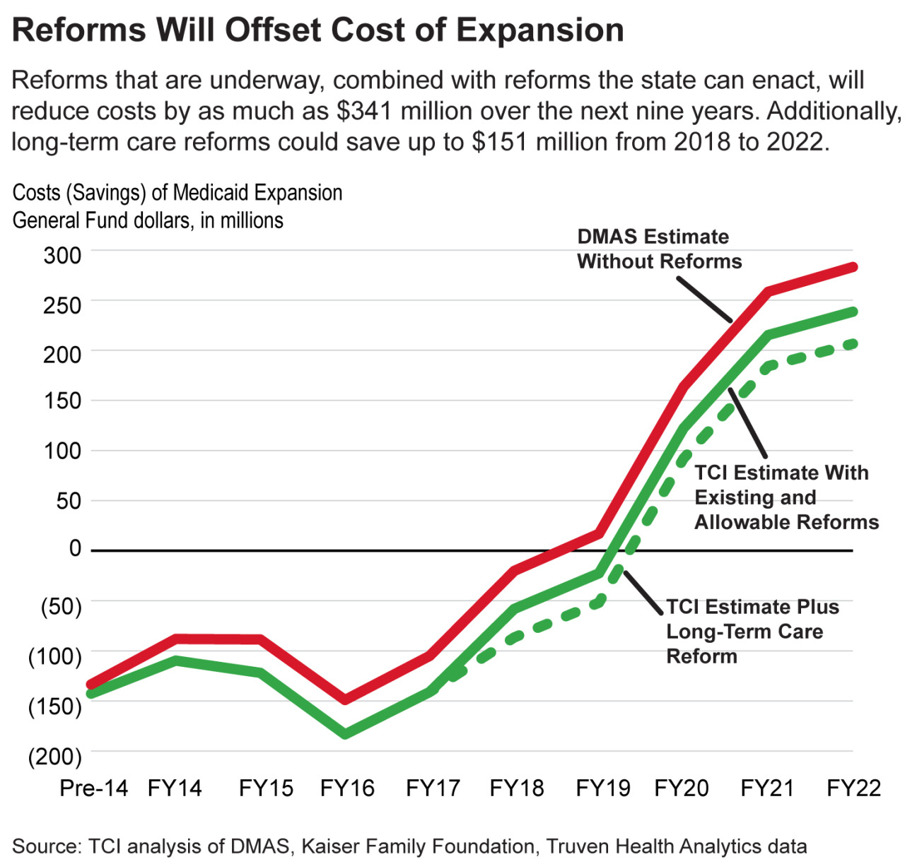 According to the report, reforms currently underway will produce an estimated $325 million in savings from fiscal year 2014 to 2022. The report also found that additional Medicaid reforms could produce immediate savings and are fully within Virginia’s control to implement now.